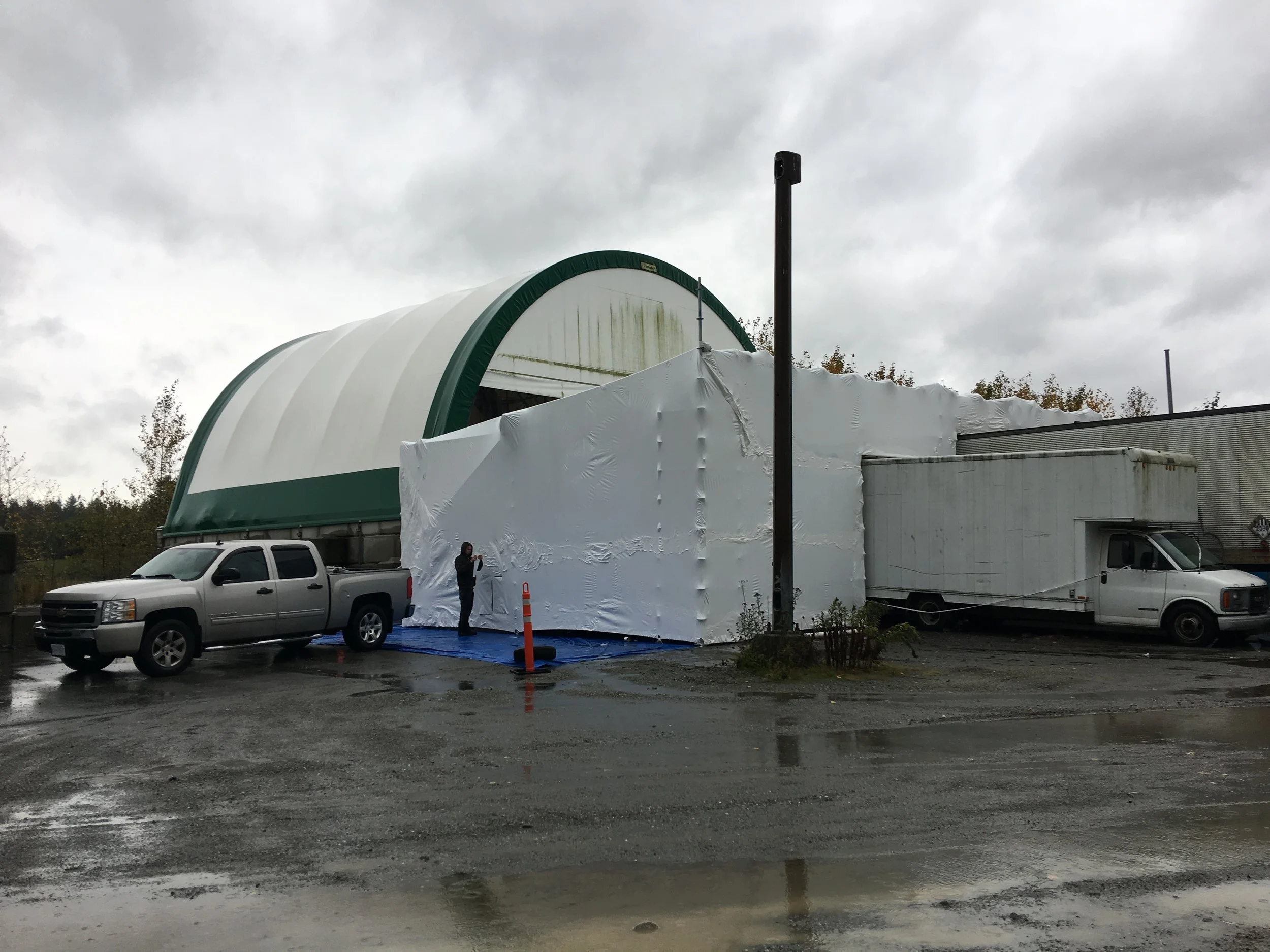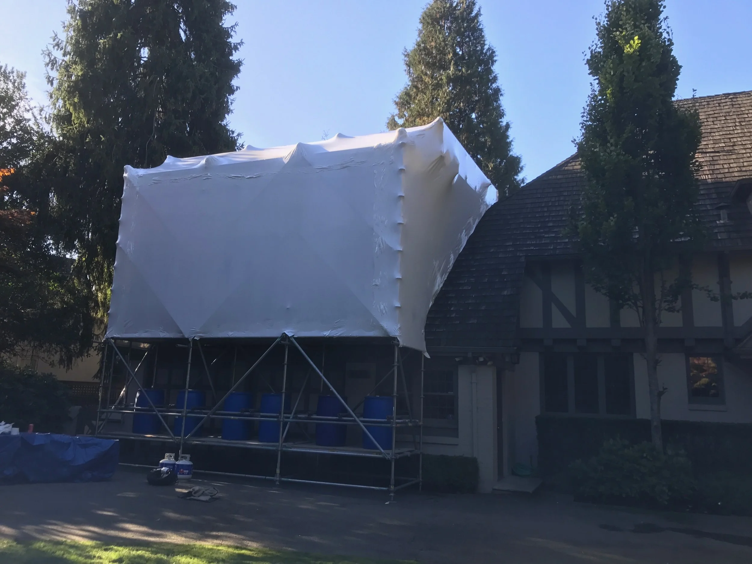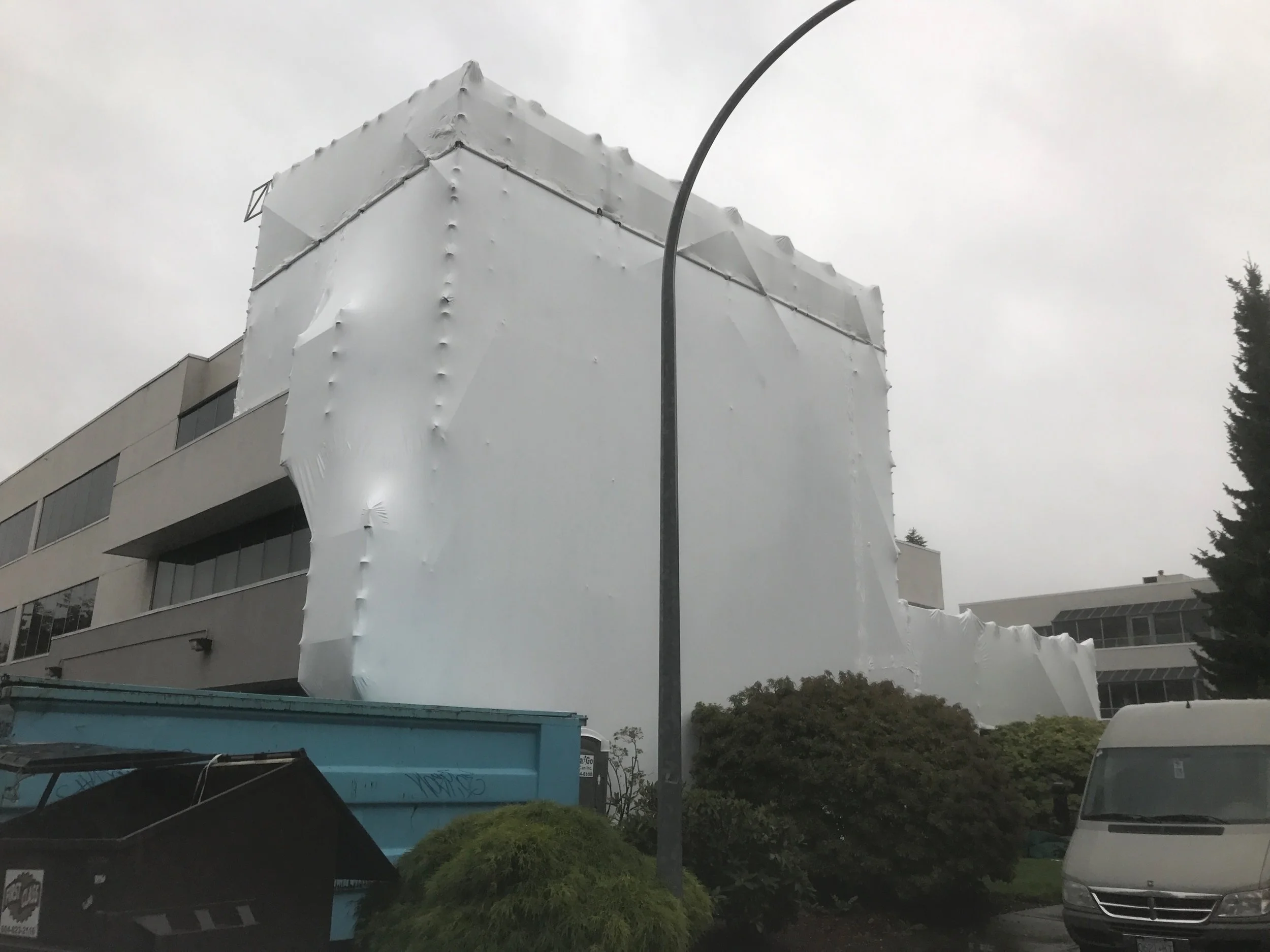 This shrink wrap canopy keeps the water off the facade while the stucco is removed and replaced.