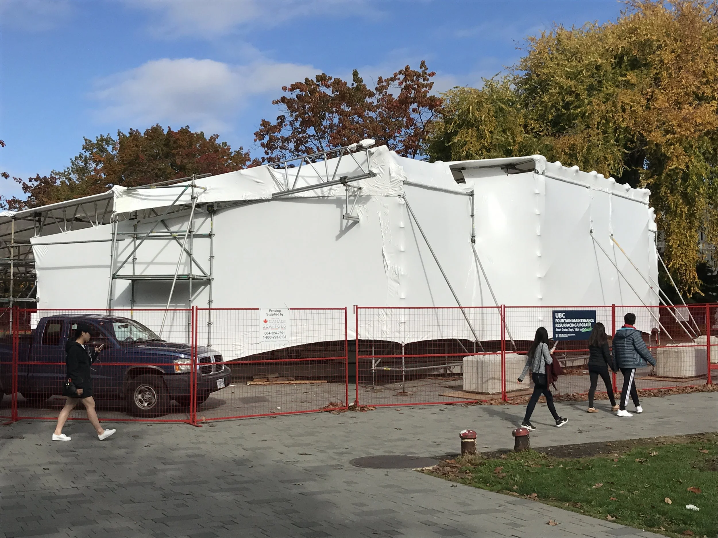 Built by Canada Scaffold, this Containment was Shrink Wrapped to allow for restoration of an exisisting fountain at UBC